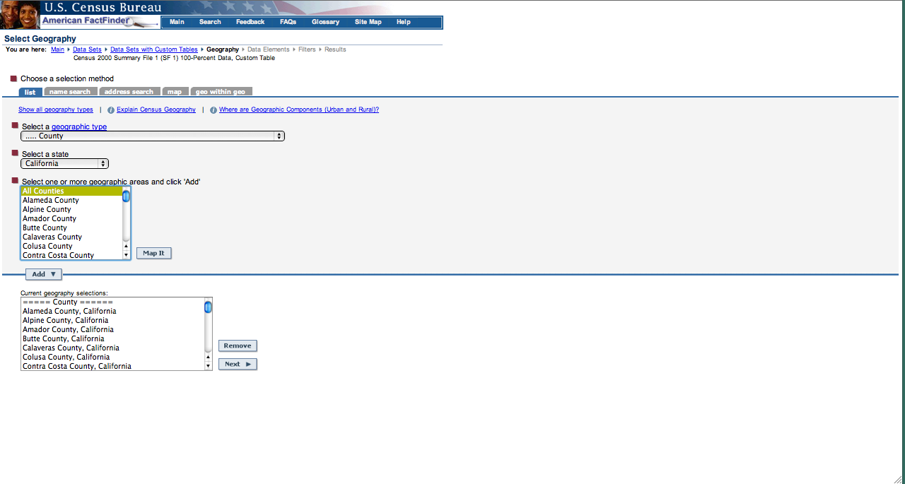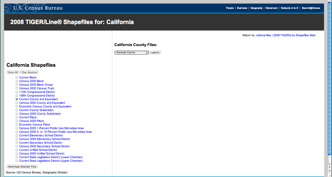The county geographic data being used in this post was collected at the U.S. Census Bureau website for 2008 California Shapefiles. I clicked the box next the " Current County and Equivalent" file and then "Download Selected Files" This allowed me to download the boundary files for all of the California counties.