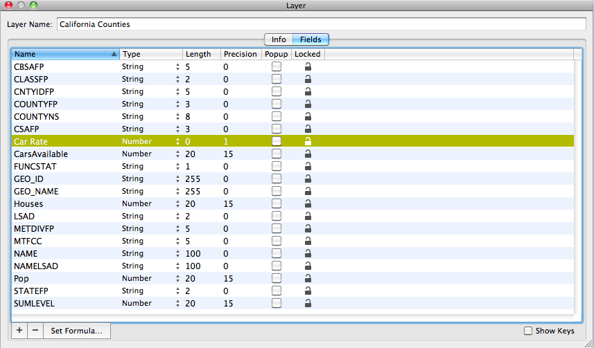 Next, in order to make rate comparisons between counties I calculated the rates for the number of cars per household. To calculate the rate click on Window > Show Layer Info > Click the Field tab. The next step is two-fold. I clicked the "+" button to add a new column to the California counties shapefile, and then renamed the new column Car Rate.