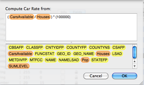 Next to determine how the column will be calculated I clicked the "Set Formula" button...this will bring up the compute columns window which allows you to drag and drop variables into the window. Then you can input mathematical operators that will calculate the rate. To calculate the rate of cars per household I divided the aggregate number of households with at least one car available by the total number of households and then multiplied the quotient by 100000.