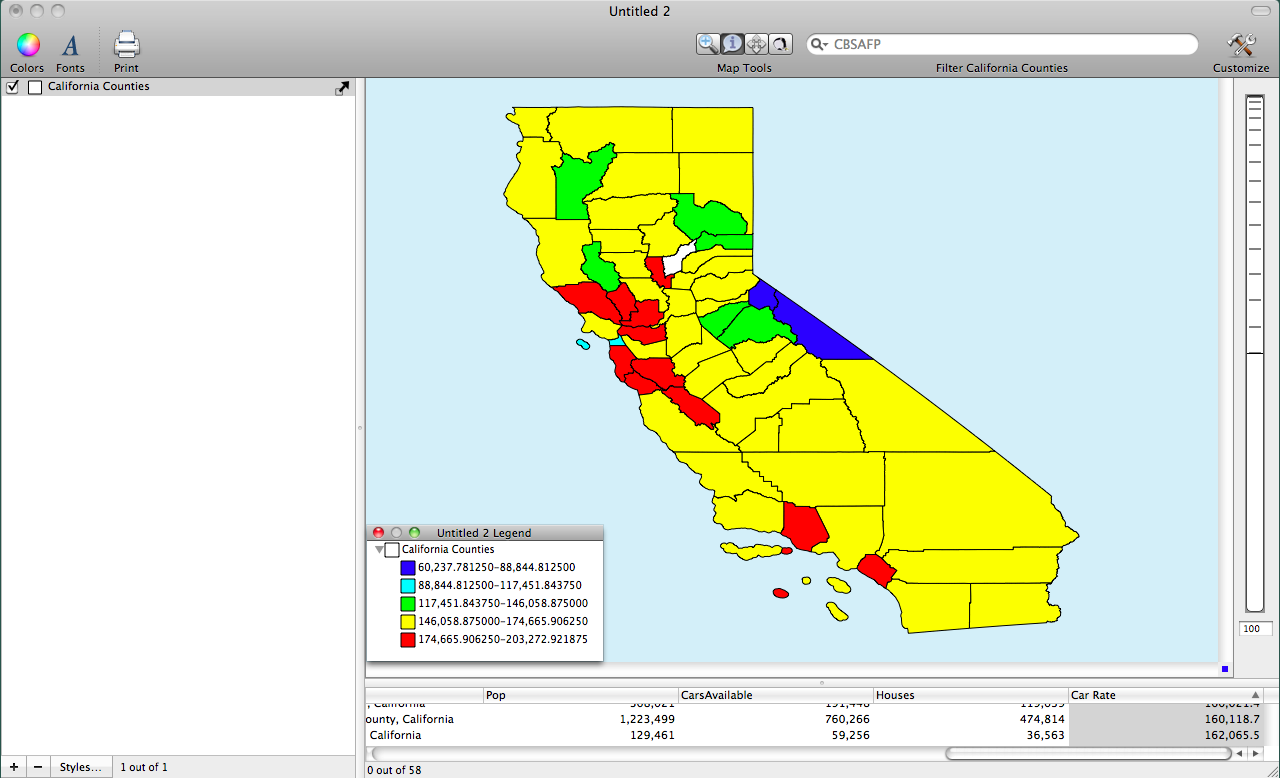 Rates are useful when we need to compare geographic units that have unequal distributions of population. For example, if we wanted to compare car ownership for two California counties, say, Los Angeles County and Fresno County we would want to take into account the populations of each county. If we did not take into account the population then we might conclude that people in Los Angeles are more likely to own cars than people in Fresno. However, it is possible that this is not the case. It may be that the density of car ownership is much higher in Fresno County than it is in Los Angeles County. In the following text I highlight how to create rates in Cartographica and I show you where to find GIS data to practice with.