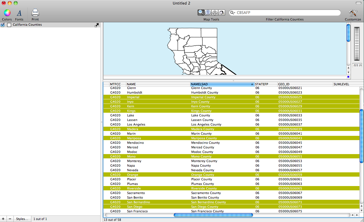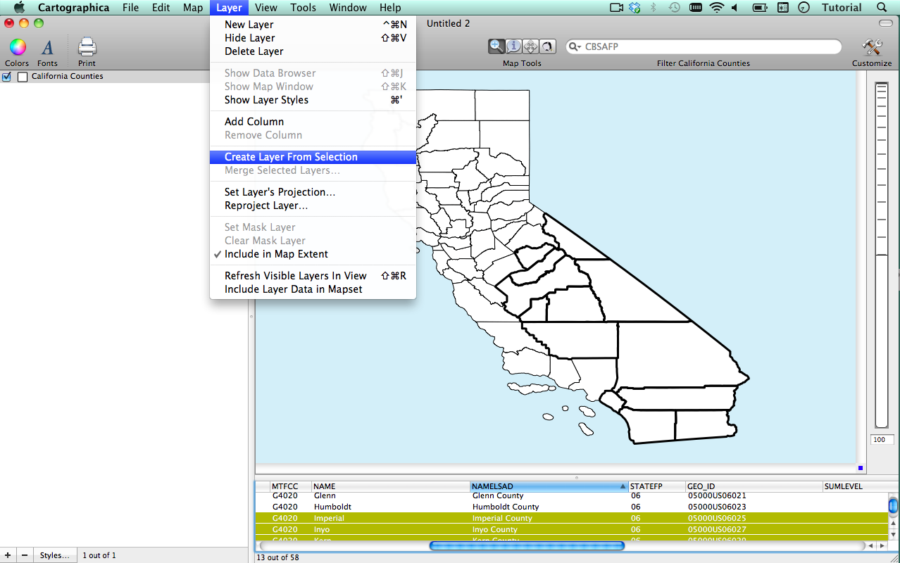 After importing the County file into Cartographica I divided the counties by selecting all of the counties listed in the list above by simply selecting them in the data viewer. I show this process in the screenshot below. After the county names are selected I used the Create Layer From Selection tool.