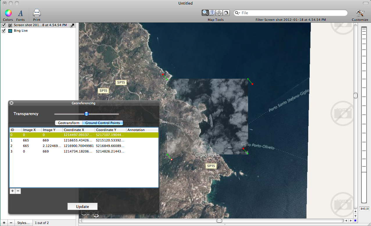 The first step in using an image like the one downloaded from Digital Globe is importing it into Cartographica as a raster file and then georeferencing using a reference map like the one provided though the Bing Live Maps feature.
