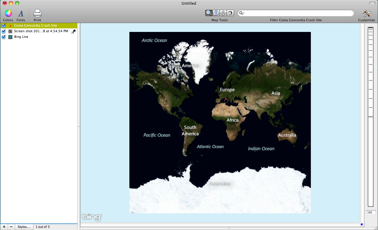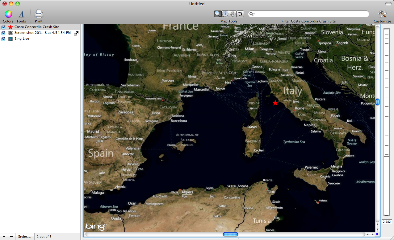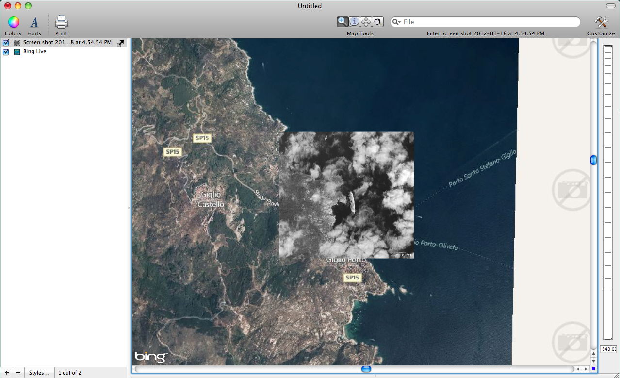 This post shows an image downloaded from Digital Globe that depicts the wreckage site of the Costa Concordia cruise ship. The ship wreck occurred off of the coast of Italy and is still currently being handled by officials there. There has been much media attention given to ship's captain who mysteriously abandoned ship before many of the passengers. He was taken into custody by Italian officials. For this post, I georeferenced the Digital Globe image using Cartographica so that we can create more informative maps and new data layers.