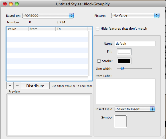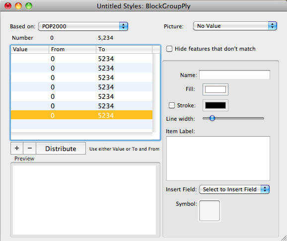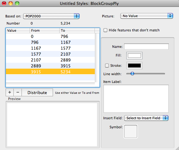 Select the field that you are interested in (POP2000) and click on the "+" button in the window seven times in order to create the number of categories needed for the example.