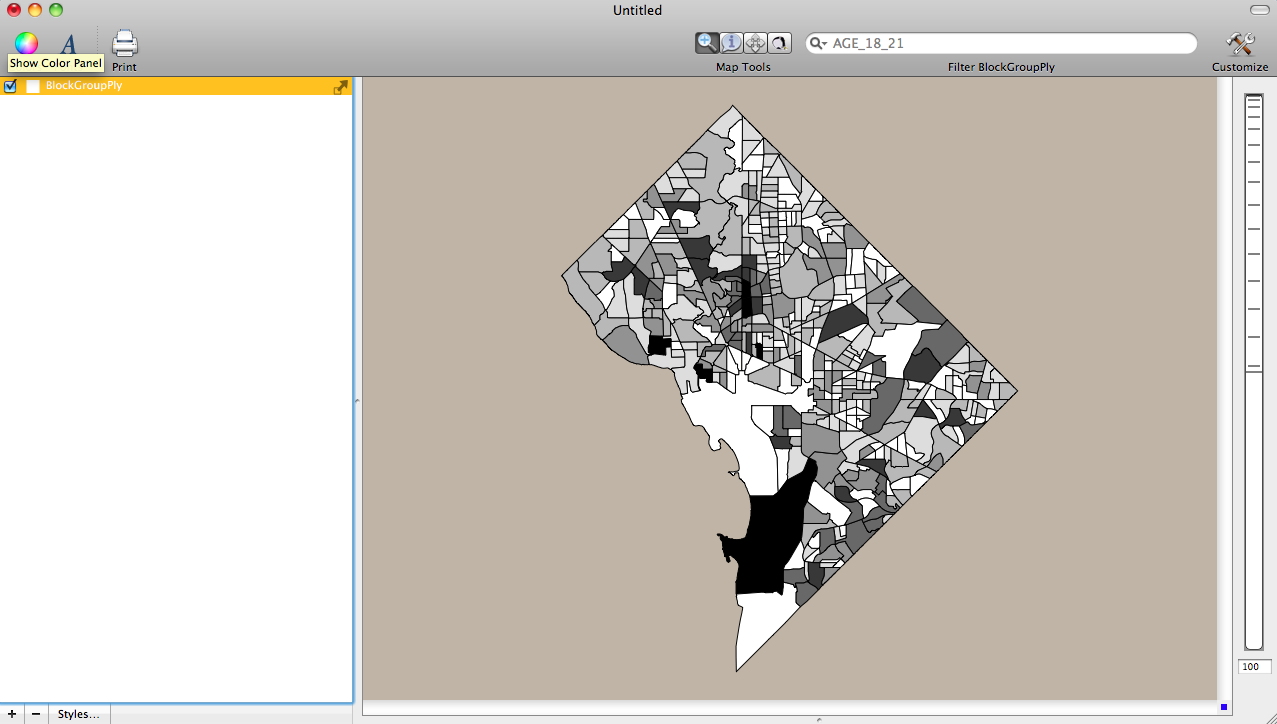 The final step is identifying each newly reclassified category with a unique color so that it can be represented on the map. The best way to to do this is go to Window and then Show Color Palettes and then drag and drop the color ramp onto the Block Group layer. This will assign the color ramp to the seven categories in order from the lowest category to the highest. Also users should note that they can create unique color ramps while working inside of the Color Palette Window.