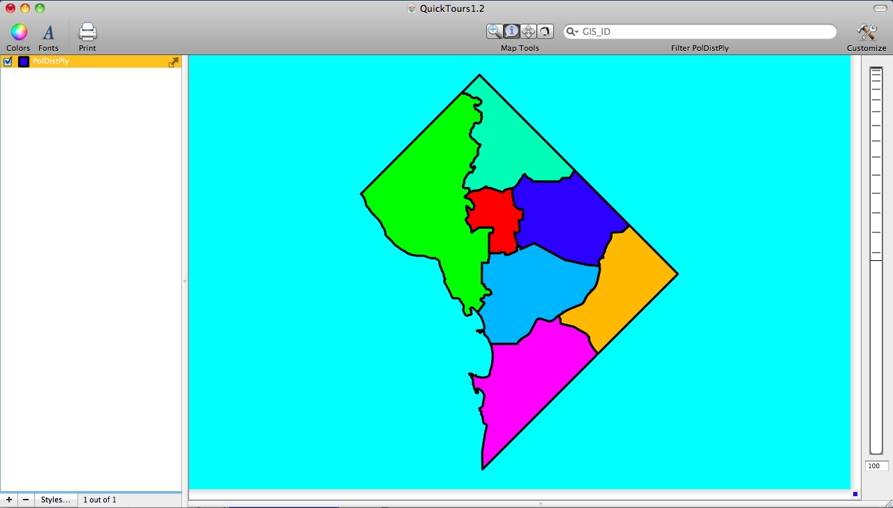 First design a mapset that you want to export into Google Earth. In the example below we are going to use Washington D.C. data to show where Police districts located on the map. Then we are going to export to a KML and open the file in Google Earth. Once you have set up your map to look the way you want simply choose Export Map from the File menu.