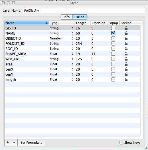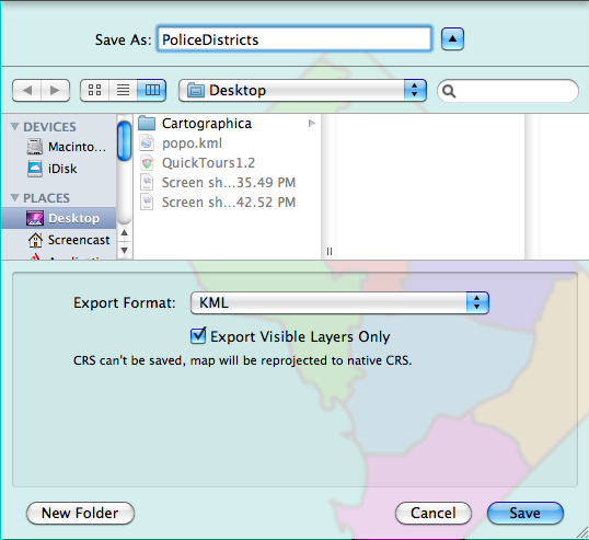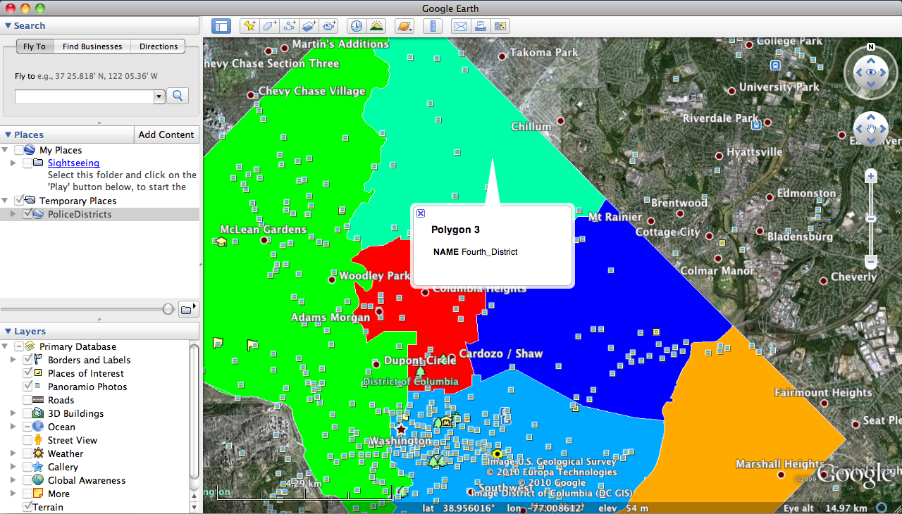 A nice option within Cartographica 1.2 is the ability to choose information that will popup in Google Earth. To do this click Window, Show Layer Features, and under the Popup field check Name. The name of each police district will now be visible in Google Earth.\