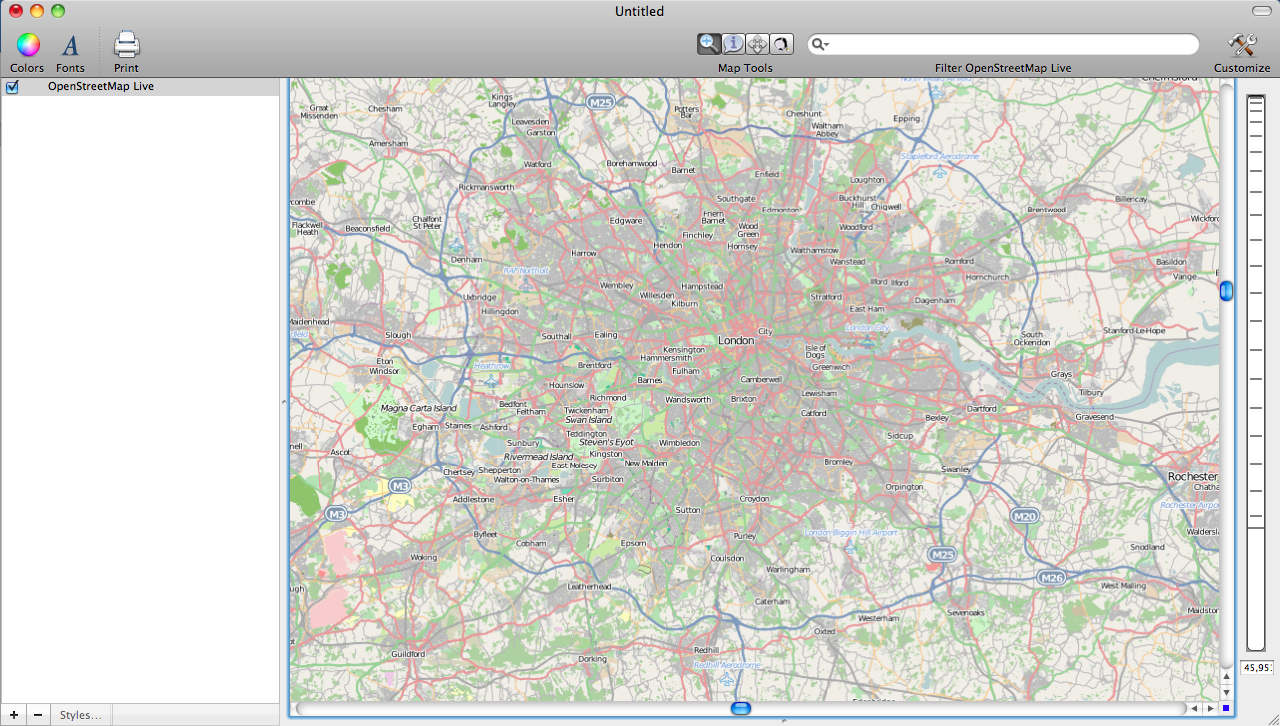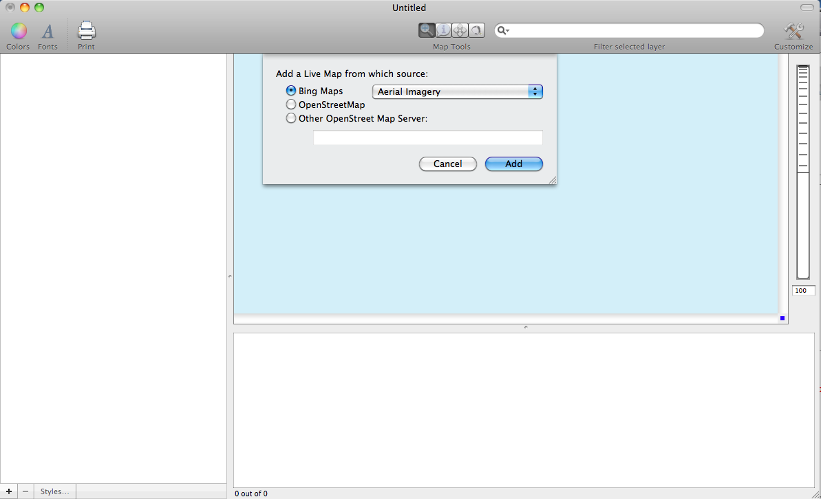 A new feature of Cartographica 1.2 is the ability to add Live Maps to documents. Cartographica has the ability to directly use data from Bing, OpenStreetMap, and or any OGC-compliant Web Map Server. Each of these data sources can be displayed in Cartographica, and additional layers can be added for analysis.