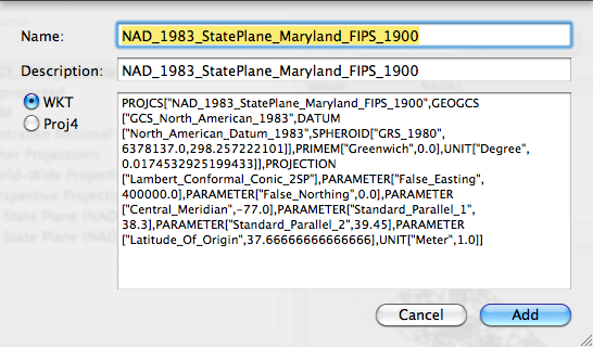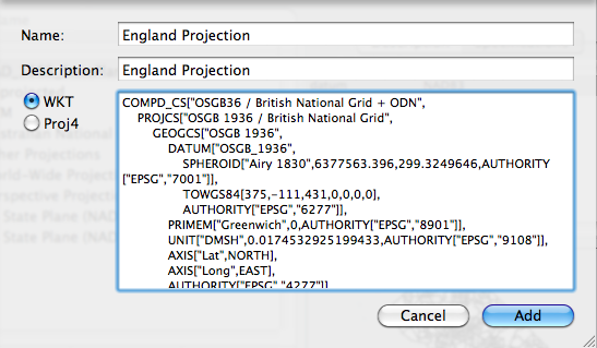 Further, projections can be edited directly using the +, -, and Edit buttons at the bottom of the list. These provide for fine-grained control of the projection by allowing you to edit the projection in its native PROJ4 or WKT form. Although not very difficult, an understanding of the meaning of the parameters is necessary in order to get good effects from this process. You will note that if you click on the Edit button while a system projection is selected, a new copy of that projection will be created for you to edit. For those who are interested in tweaking particular parameters and who are looking to understand the Proj4 format better, there's a detailed article on Proj4 General Parameters at the OSGeo web site that is the home of Proj4.