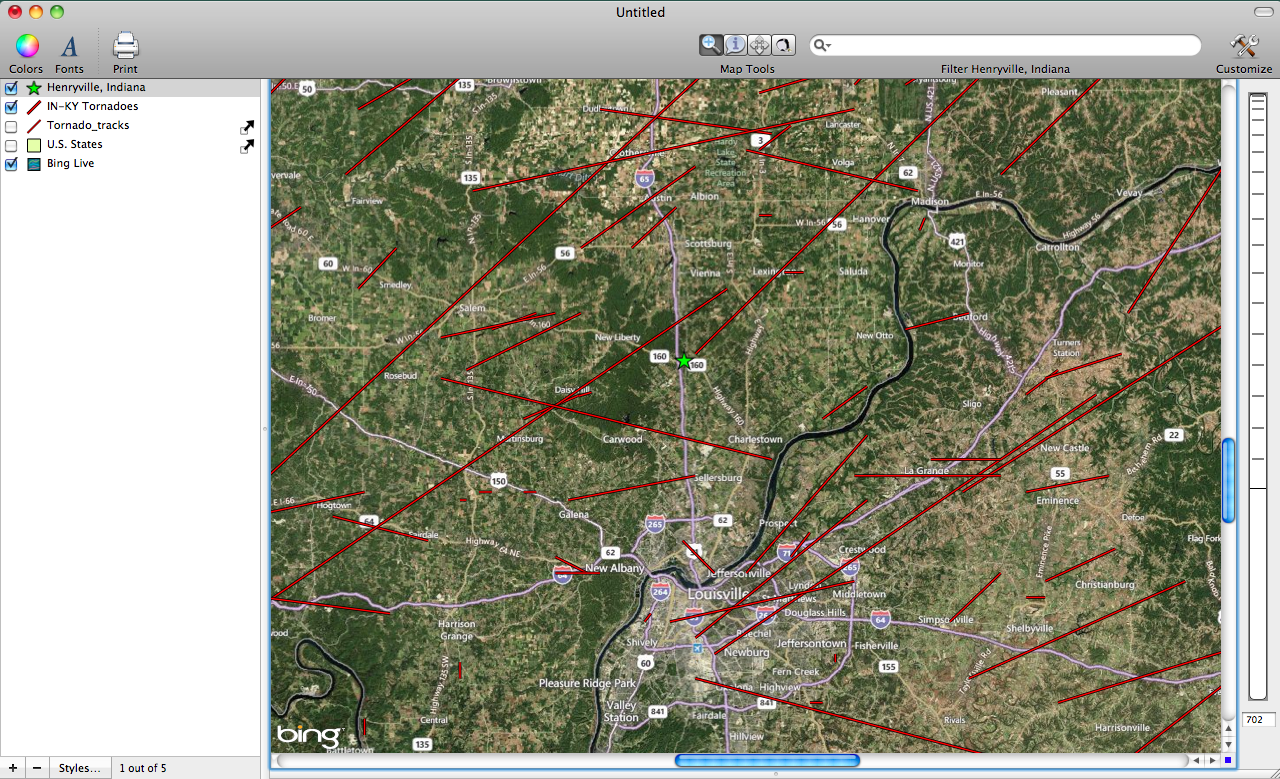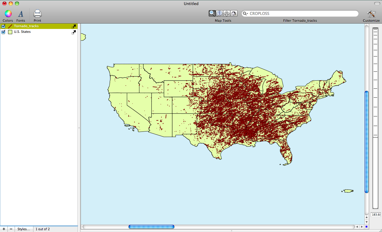 I found some interesting data on Tornado tracks from this NOAA website. Tornado tracks are lines that track the movement of tornados as they advance from an origin point. You can download the Tornado_Tracks.zip file beneath the tracks image on the website. Once you download the data import it into Cartographica by choosing File > Import Vector Data. The data set is extensive as it covers tornados from 1950-2010. I provide an image of the file below.