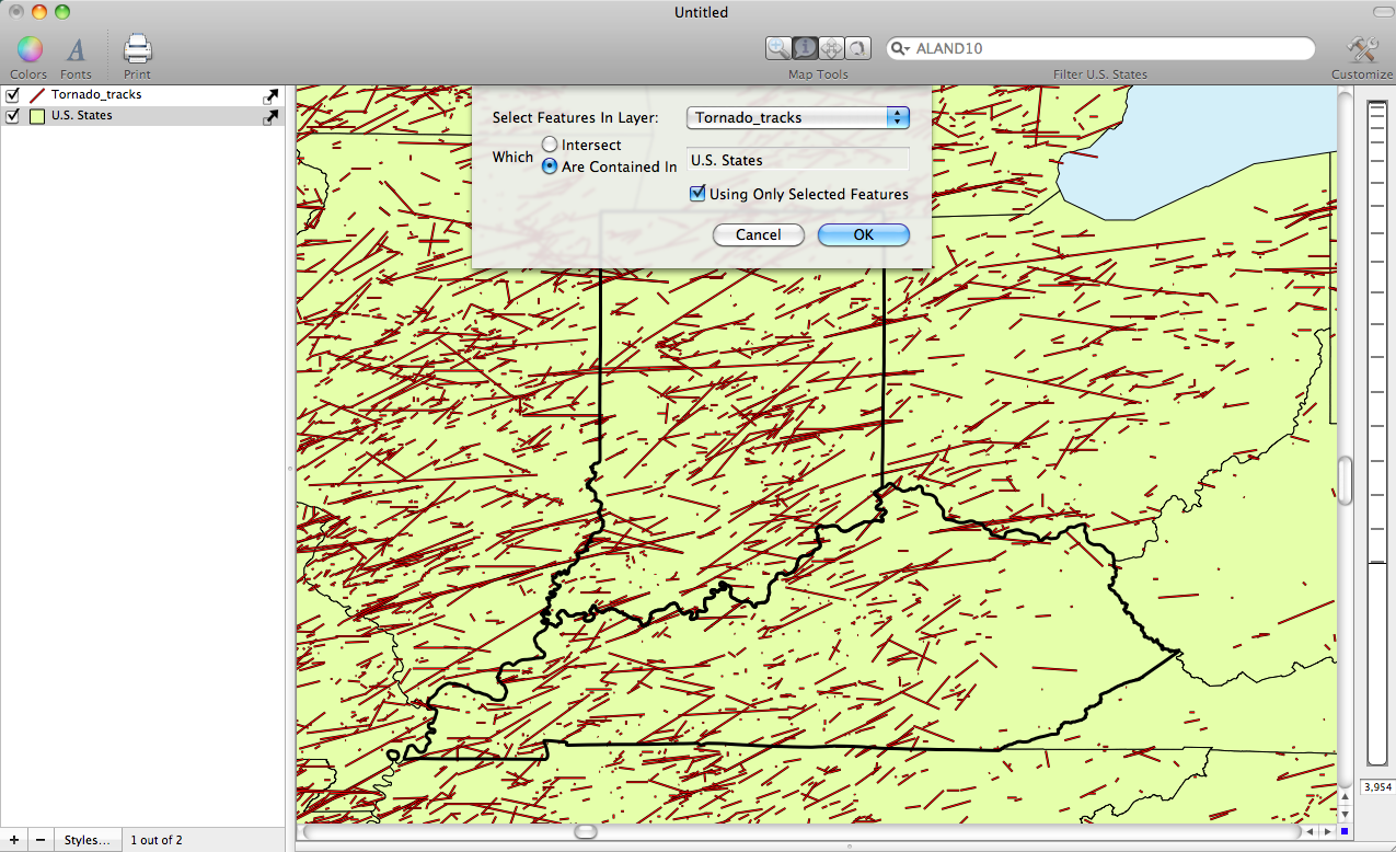 Next, I wanted to create a map that only includes tracks in Indiana and Kentucky. To select only the tracks within Indiana and Kentucky select the U.S. States layer in the layer stack, then select the identify tool, and while holding down the shift key, click on Indiana and Kentucky. Both States should be highlighted. Next, choose Edit > Select on Another Layer. Set the Select Features in Layer to Tornado_Tracks and choose the Are Contained In option. Then click OK.