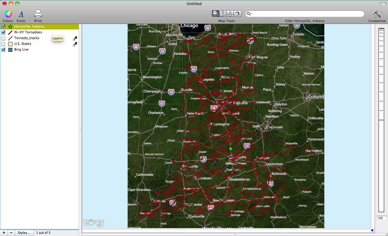 You will see that all of the tracks in Indiana and Kentucky are selected. Next, we can create a new layer that only contains those tracks in Indiana and Kentucky. Choose Layer > Create Layer From Selection. This will add a new layer to the layer stack. Rename the layer IN-KY Tornadoes. I provide an image below.