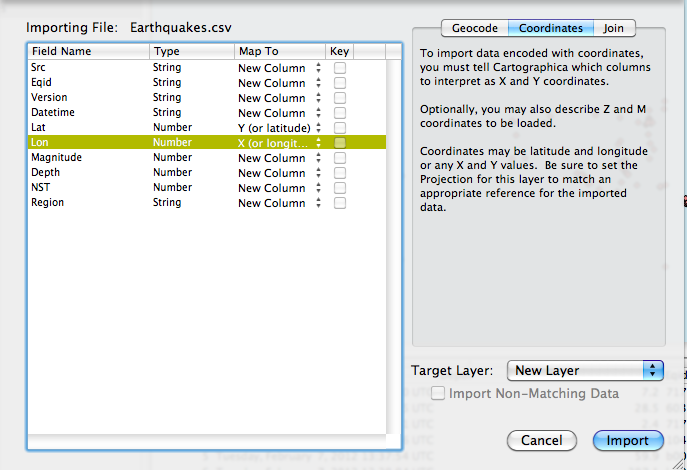 Next, the import data window will appear. The .csv file is download with latitude and longitude data that we can use to create a point map of earthquake locations. Select the "Coordinates" tab in the top right of the import file window. Then change the designations next to Lat and Lon in the table to Y (or latitude) for Lat, and X (or longitude) for Lon, and then click Import.