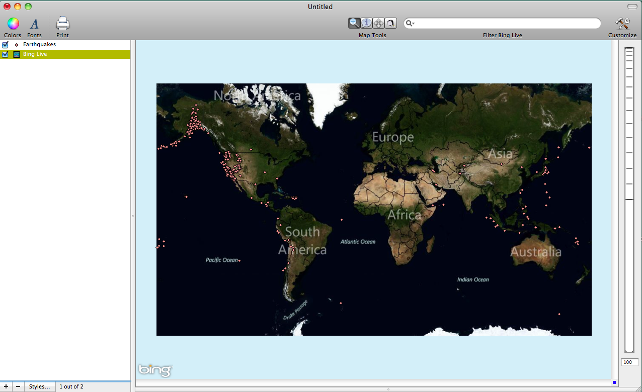 After the points are geocoded you can see them in the map widow within Cartographica. However, to contextualize the points we need to add a base map. This is quick and easy to do in Cartographica. Choose File > Add Live Map. This will add a new base map to help visualize where the earthquakes are located. A screenshot is provided below of the points with the base map.