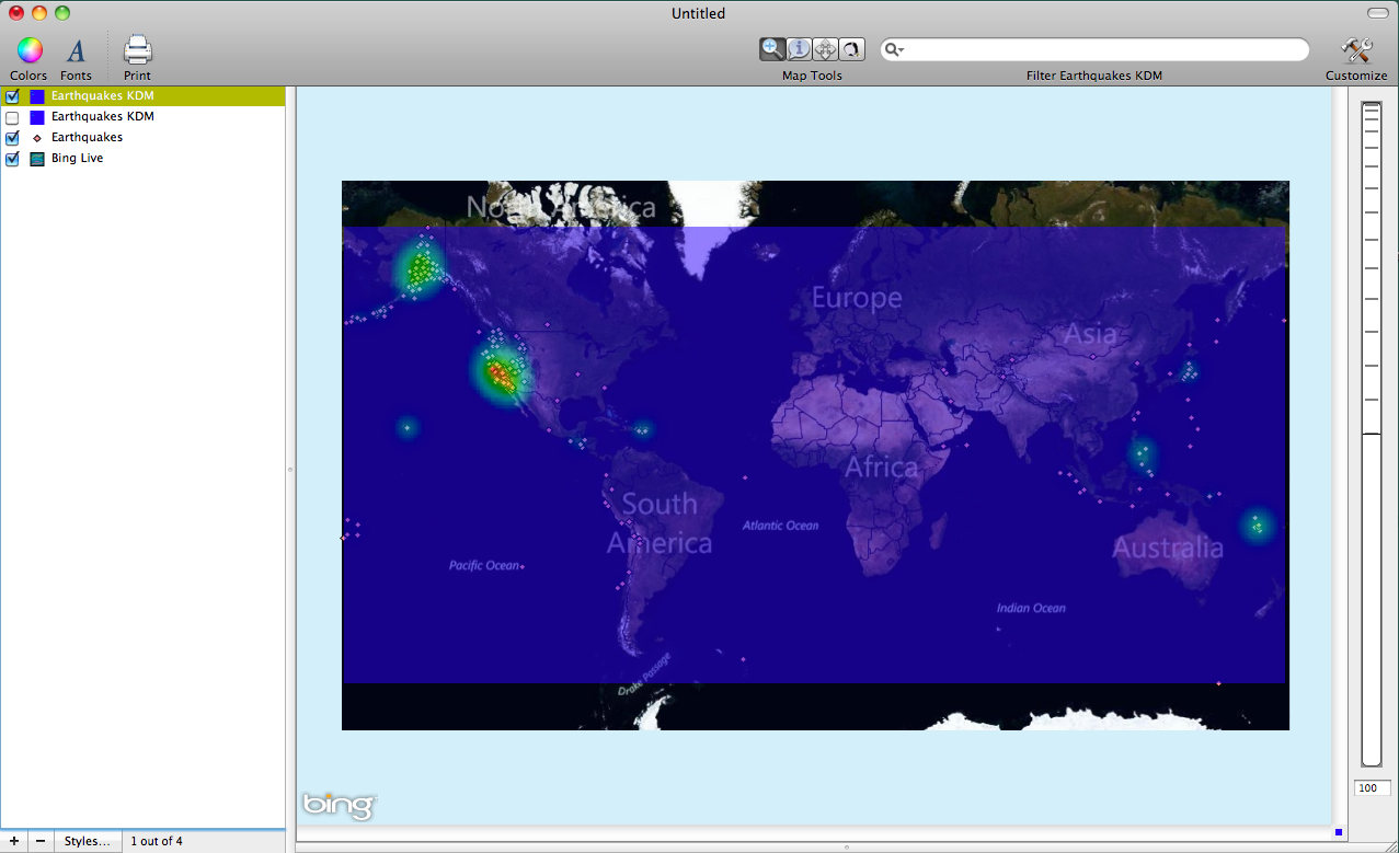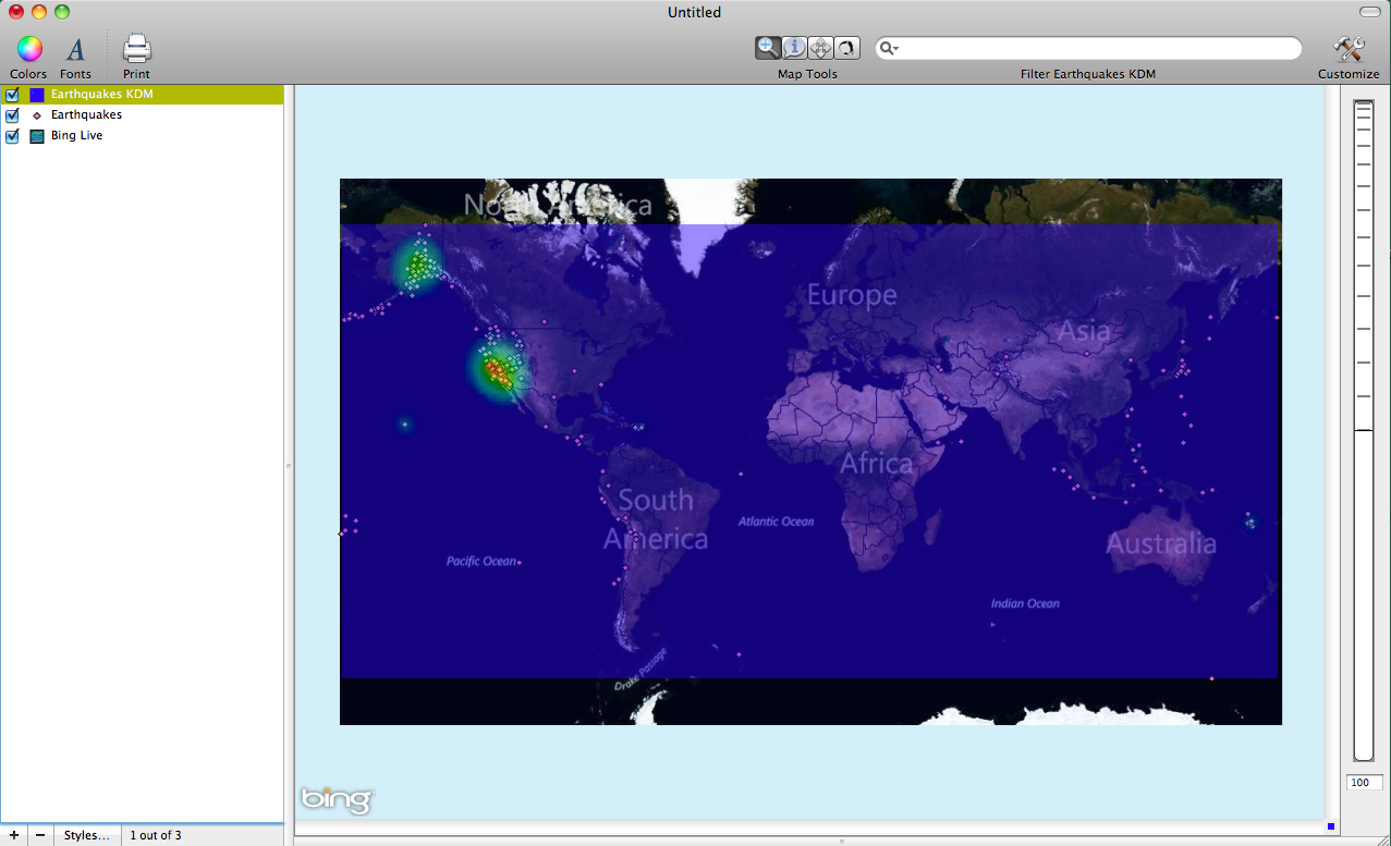 Visualizing the points on the map is only one way we can use the data. We can also create a kernel density map to determine where the highest concentration of seismic activate has occurred over the last seven days. To create a kernel density map select the Earthquakes layer in the layer stack and then hold down the option key and choose Tools > Make Kernel Density Map... This will bring up the Kernel Density window. Change the Kernel type to Exponential (Negative) then click Analyze. A screenshot is provided below of the kernel density map. Note: The layer opacity was changed by double clicking on the the Earthquake KDM layer in the layer stack and then adjusted using the opacity slider. The results indicate that much of the world's seismic activity as been focused on the U.S. West Coast and in Alaska.