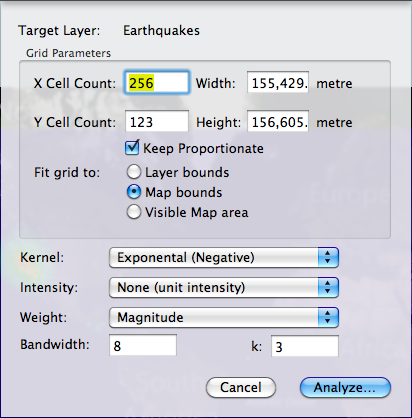 To create a second kernel density map that takes into consideration the strength (or magnitude) of the earthquakes I created a weighted kernel density map. To do this hold down the option key and choose Tools > Make Kernel Density Map... This will bring up the Kernel Density window again. Change the Kernel type to Exponential (Negative) and then change the Weight menu to Magnitude.