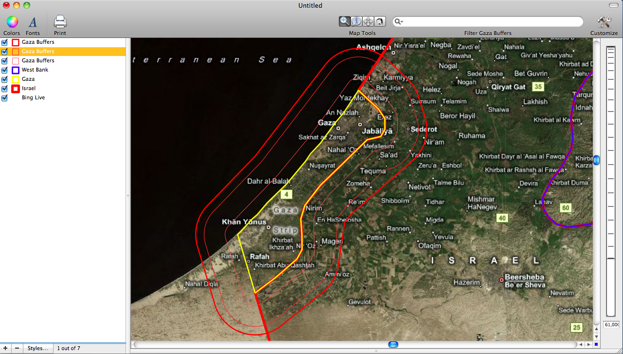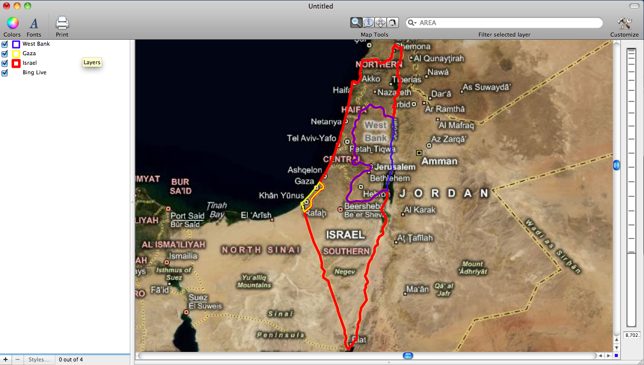This post uses a combination of several different data sets. The base maps used in this example were collected at Doc Savage's website who is a Archaeologist that works in the region. In the first image you can see the political boundaries of Israel, Gaza, and West Bank, which are our regions of interest. I compiled and collected data on the types of rockets and the various ranges associated with each one.