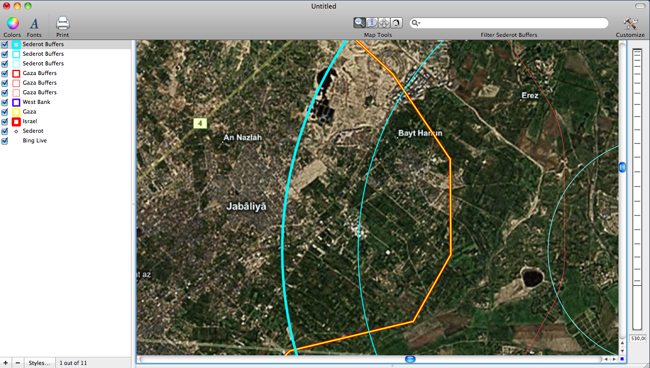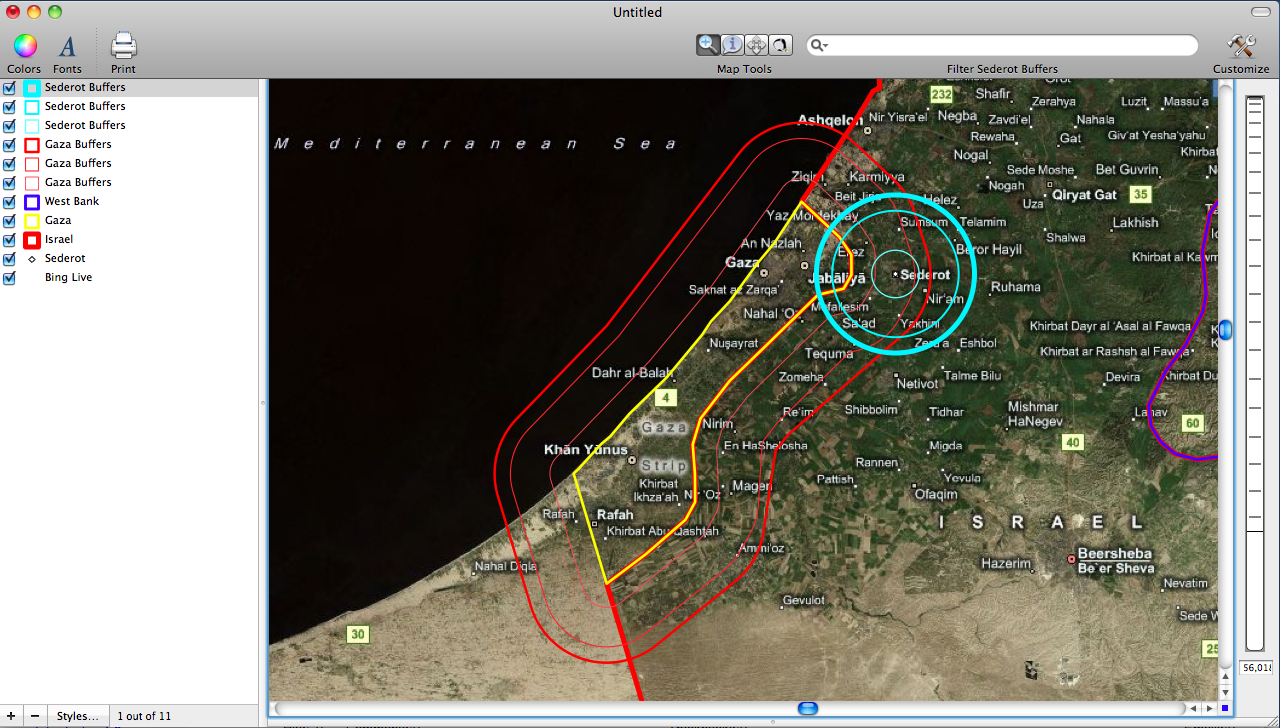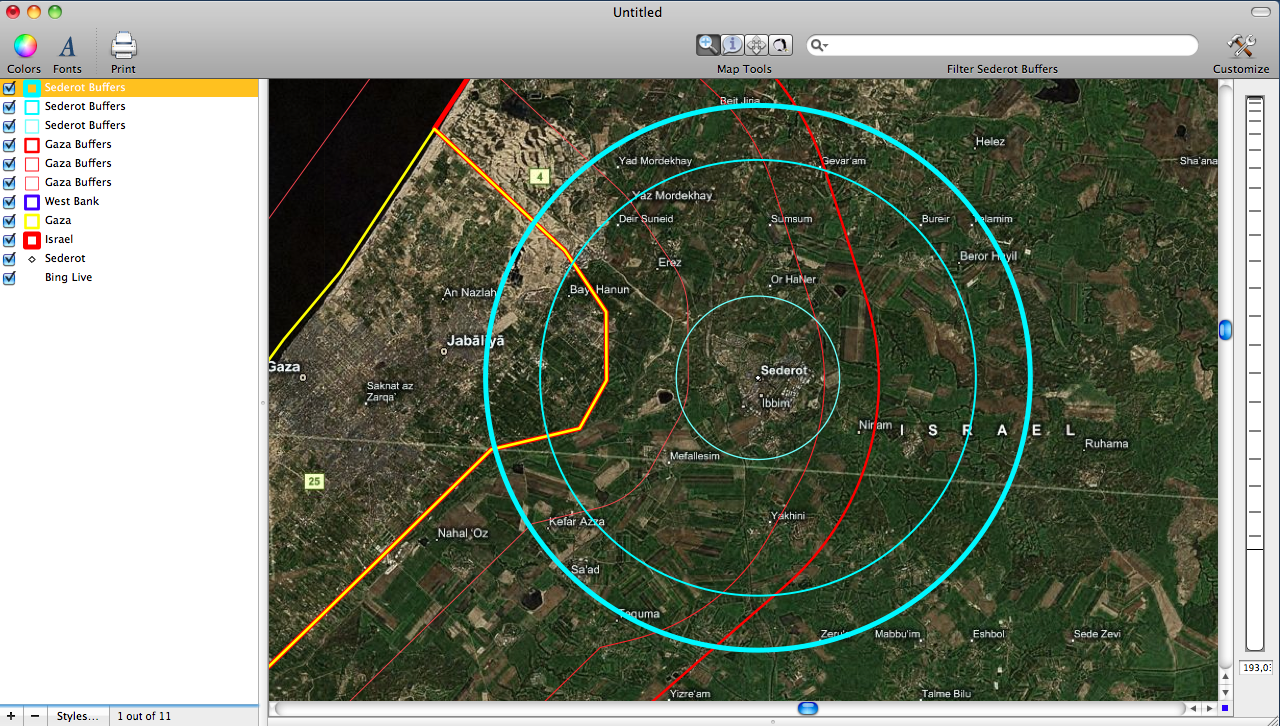 In most of my research on the rocket attacks it appears that most originate from Northern Gaza. Sederot is a Southern Israeli city that is regularly hit in rocket attacks, and it is located Northeast of Northern Gaza. We can use a process of creating buffers around Sederot to determine where it is most likely that attacks are originally launched. The third image shows the buffer around Sederot at 3km, 8km, and 10km. The areas where the Gaza border and the Buffers from Sederot intersect are the locations where attacks can be expected to come from when a rocket hits Sederot. The fourth image is a look at the areas identified as likely places where attacks originate from. Finally, the fifth image show the full extent of the situation with both sets of buffers shown.