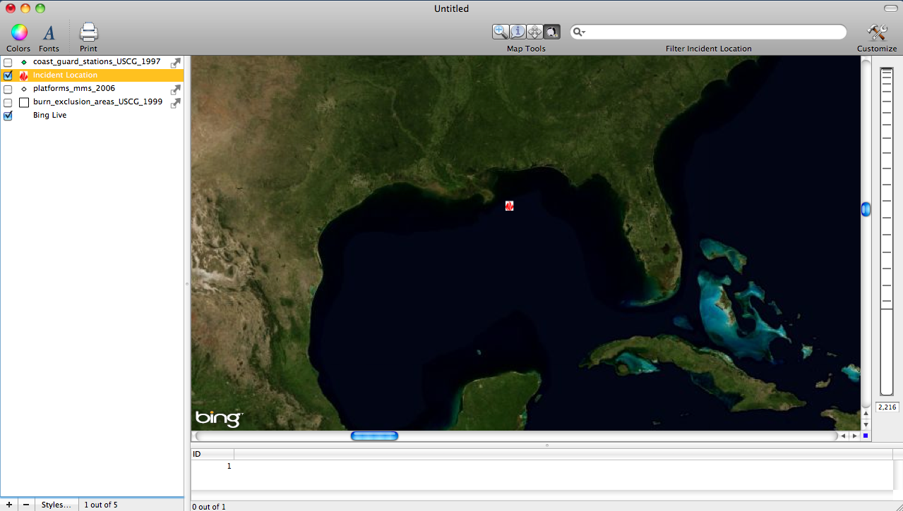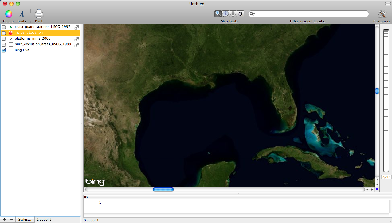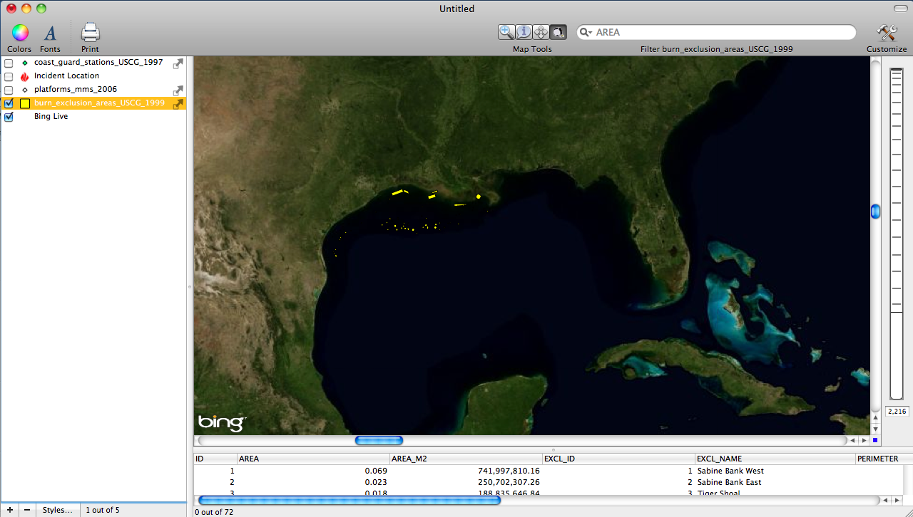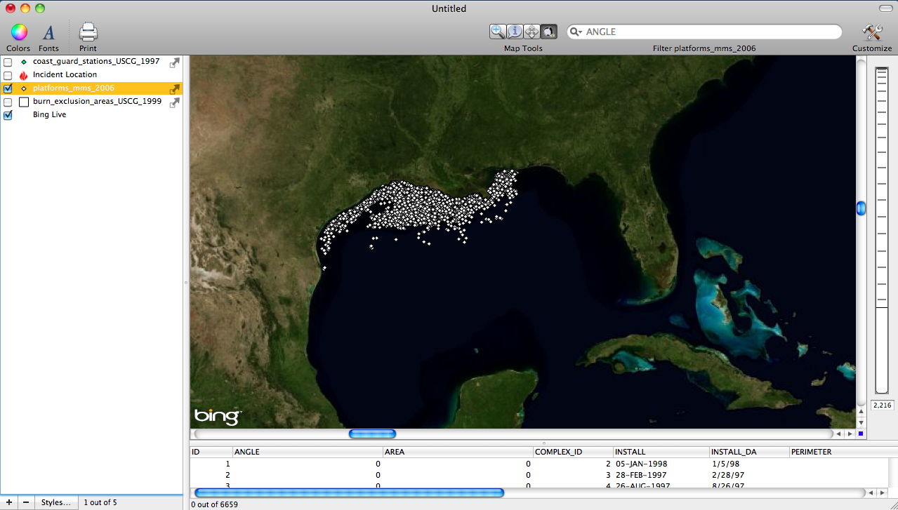 In light of the massive oil spill ongoing in the Gulf of Mexico this post is designed to highlight locations for data relevant to the spill, and to show these data in use in Cartographica. The BP oil platform Deepwater Horizon exploded on April 20 and resulted in the deaths of 11 crew members. The subsequent fire caused the extreme deepwater oil rig to sink causing the largest oil disaster in U.S. history. In hopes of promoting more understanding about the incident several websites have offered GIS data regarding the incident.