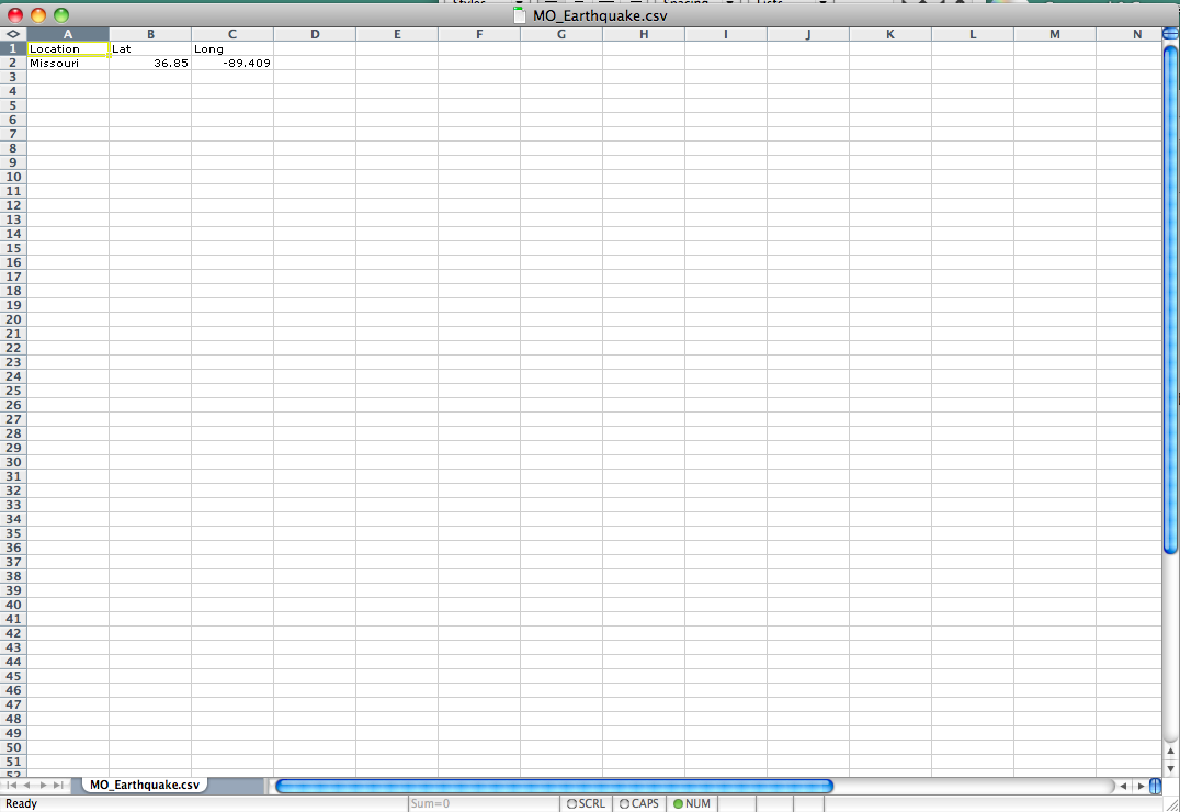 To create the .csv file you will need a spreadsheet application. Once the application is open create new column headings for Location, Latitude, and Longitude. Once the column heads are labeled, add the data from the Big Earthquakes List for the 4.0 East Prairie, MO earthquake. Save the file as MO_Earthquakes.csv.(Note: The lat long data are given as N and W. Make the Longitude value negative to indicate that it is the Western hemisphere. The positive value for latitude already indicates the Northern hemisphere). I provide a screenshot of my .csv to show the set up.