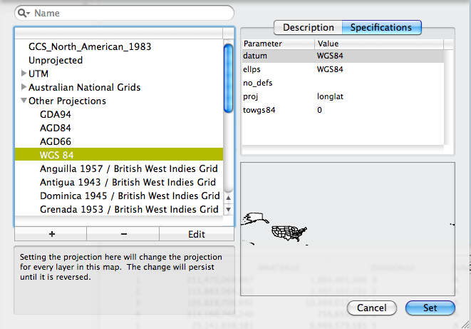 Next, in order to be sure that our coordinates are in the same system as those provided by CERI we can view the projection of the map by choosing Map > Project Map. When you do this with the Census shapefile you will see that the map is projected in GCS_North_American_1983. The coordinates provided by CERI are in WGS. I know this because I found a description on their website describing their data. To change the projection of the map to WGS select Other Projections and the choose WGS84 and then click Set. I provide an image of this below.