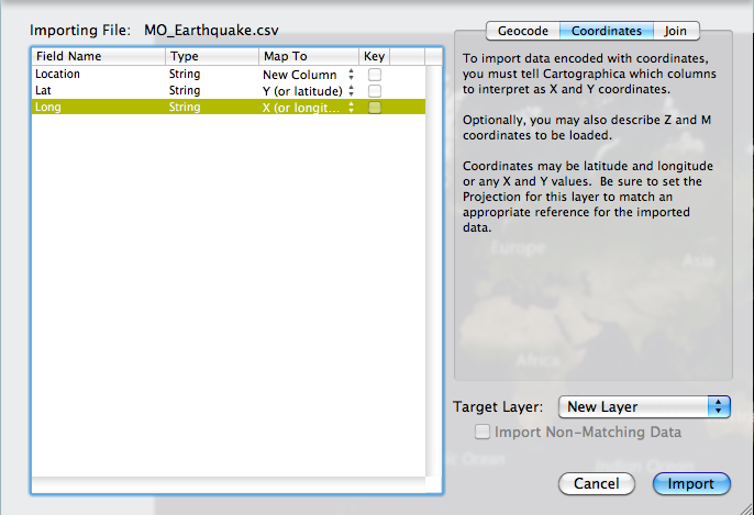 Next, to geocode the lat and long coordinates choose File > Import Table Data. Choose the MO_Earthquake.csv file. In the top right of the Import File Window select the Coordinates tab. In the table to the left change the Map to option for Lat to Y (or latitude) and change the Map to option for Long to X (or longitude). See the image below for the set up.