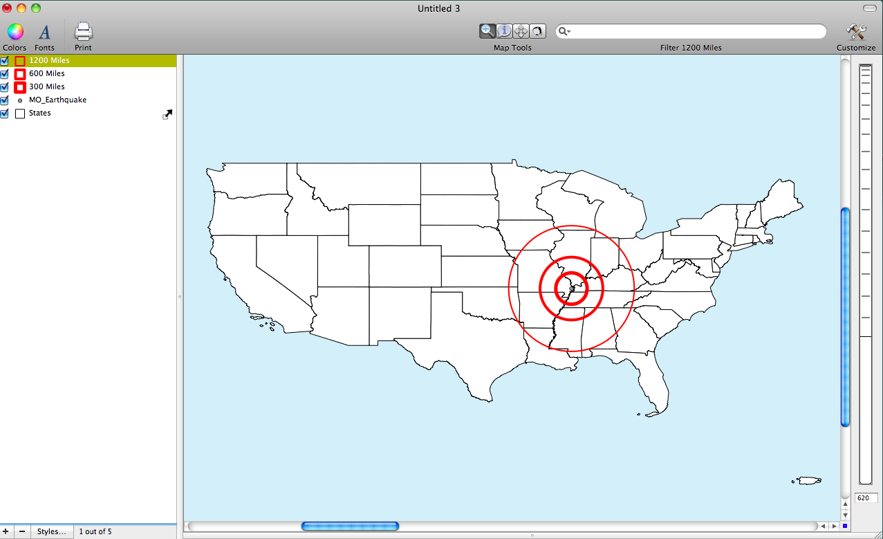 To create an interesting map I decided to create buffers at 5 (300 mi) 10 (600 mi) and 20 (1200 mi) degrees. I provide two maps below to show the final results (Note: the second map adds some additional data that I collected previously from other sources). To create a buffer at each distance simply repeat the steps from above three times while chaining the distance for each buffer. Note that to change the appearance of the buffers go to the Layer Styles Window to play with color, opacity, and labels.