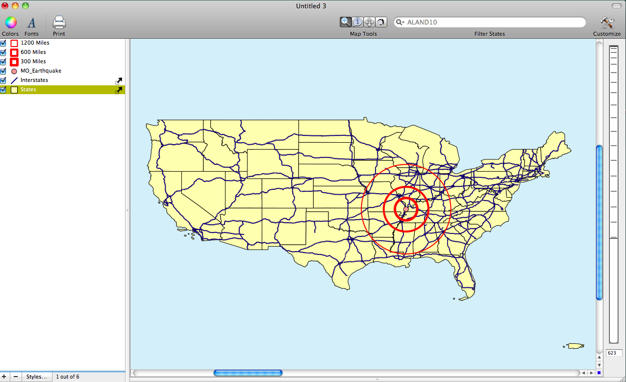 After you geocode the data you should see a single point on the map. To make a more interesting map we can use the point to create a buffer map to indicate distances around the earthquake. To create buffers choose Tools > Create Buffer for Layer's Features. Note that to decide the width of the buffer you must say how large in degrees you would like the buffer to be. How do you define buffer size in miles in terms of degrees? In general, we can say that 1 degree is = to about 60 miles unless the location is located near the poles. We can use this as a rough estimate for creating buffer widths.