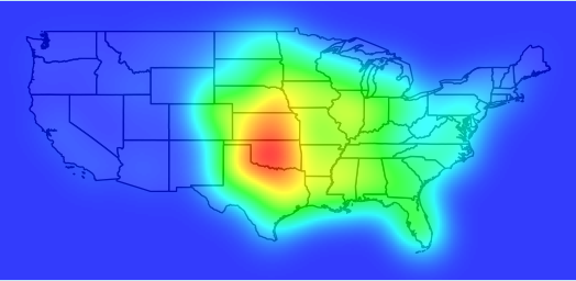 The tornado data includes a lot of information about each event including the strength of the tornado on the F-Scale, the number of injuries and deaths, how far the tornado went, how wide the path was, and of course the date that the tornado occurred. I thought this type of data would provide a really good opportunity to show some more of Cartographica's analysis capabilities so I played around with the data and I am including some screenshots of what I found with the data analysis. For the examples, I have created a Kernel Density map of all of the tornados from 1950-2006, in order to determine where the most tornados have occurred over time. Also I filtered out the the F-5 tornados and created a convex hull so that we can get a good picture of where the strongest tornados have occurred over time. The most interesting and useful aspect of this data, is that it has been collected over a very long period of time, which means that it is likely a very good illustration of where tornados are most likely to occur. I have included an image of where Tornados Alley, borrowed from Wikipedia, which can compared that to the data presented in Cartographica to see if the data we are presenting matches this general area of the country. By a simple visual comparison, it appears that the map of Tornado Alley is supported by the Kernel Density map created in Cartographica.