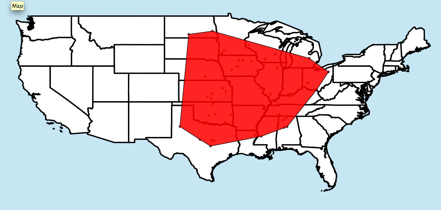 Screenshot of Convex Hull around all F-5 tornados from 1950-2006 |
