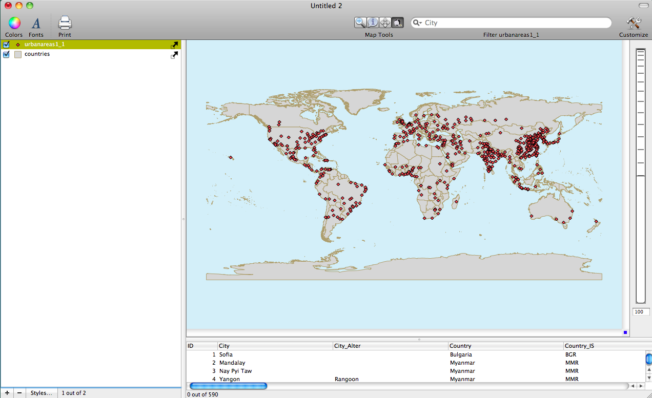 Here is a screenshot of the data imported into Cartographica. I should mention that the base map of the world was not downloaded from the Nordpil website. However, a shapefile can be downloaded from Diva-Gis I made the countries map Grey using the layer styles window so that the points could be easily seen and because I want to countries to be easily seen once I create my KDM map.
