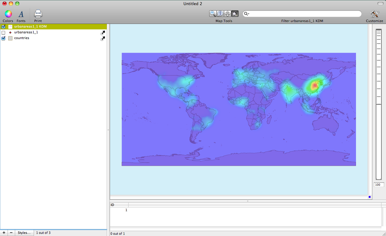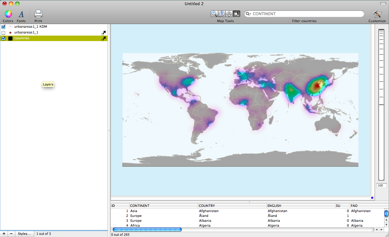 Cartographica makes it easy to quickly explore GIS data. If you need the data for professional purposes then Cartographica allows you to make sharp looking maps in only a matter of minutes, while also allowing you to visualize your data. I downloaded the city data from the Nordpil website and then created a Kernel Density Map. To make my Kernel Density map more appealing I created a custom color scheme.