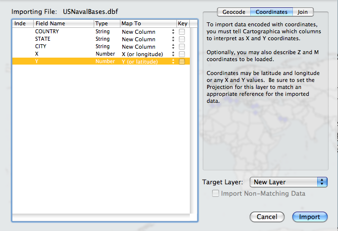 - Once the list is complete, with city names and coordinates, we can now geocode the cities based on their coordinates. Cartographica provides a way to very easily geocode this kind of data, as long as there is some kind of base-map that is projected using the same coordinates system as the one that provided the coordinates for the cities with naval bases and ports (in this case Google Earth).