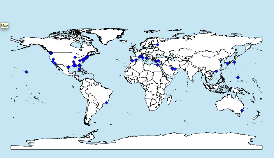 Recently a friend of mine received information in the mail about becoming a Naval Officer. In the packet of information was a brochure that included information about locations of U.S. Naval bases and ports throughout the world. The location information was simply a list of cities around the world where the bases and ports are located. I thought it would be both interesting and informative to talk about how to turn a list of cities into a map.