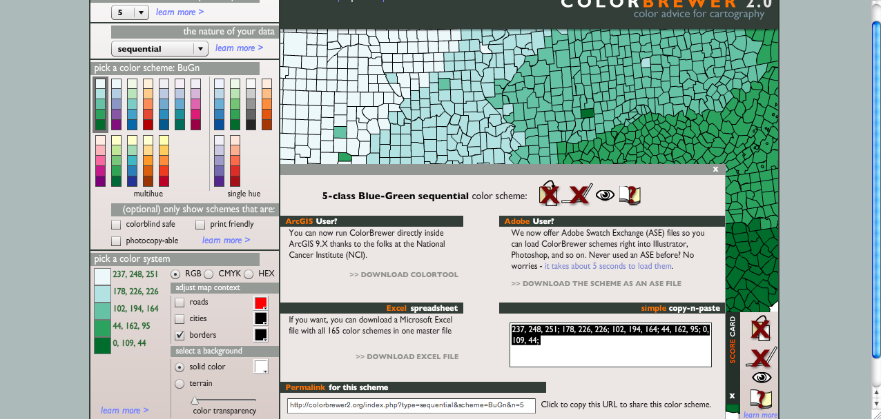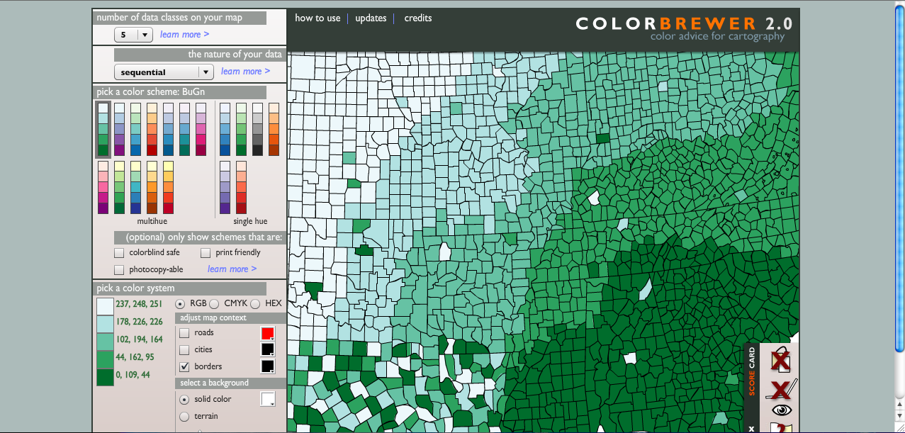 ColorBrewer is a free online database of color palettes that are designed to be used with GIS. The website allows users to select from a variety of colors that have been pre-selected and formatted for both quantitative and qualitative data. In this post I will show you the steps for quickly bringing ColorBrewer color schemes into Cartographica.