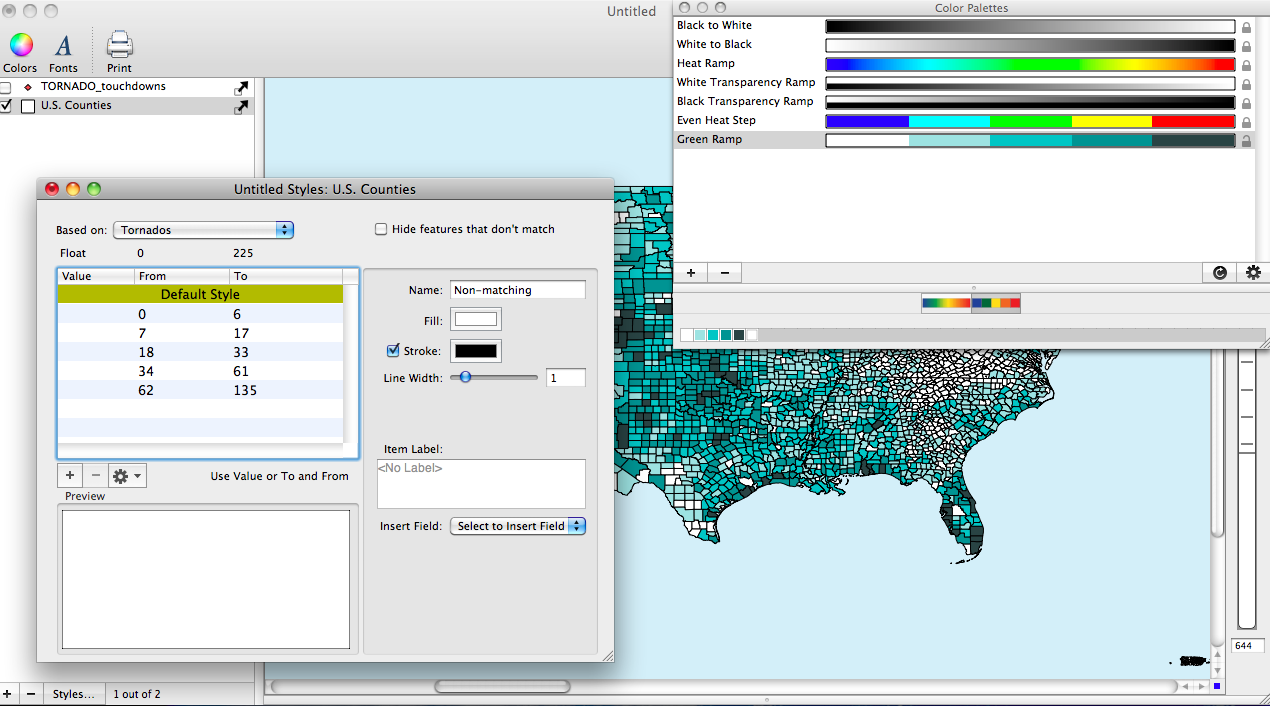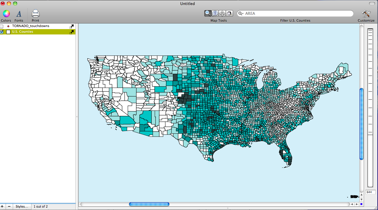 The image below shows a county level data set for the United States. The data being displayed are the number of tornados that have been recorded in the counties since 1950. The number of tornados was originally imported as a point file but was easily aggregated to the county file by using Cartographica's Count Points in Polygons tool.
