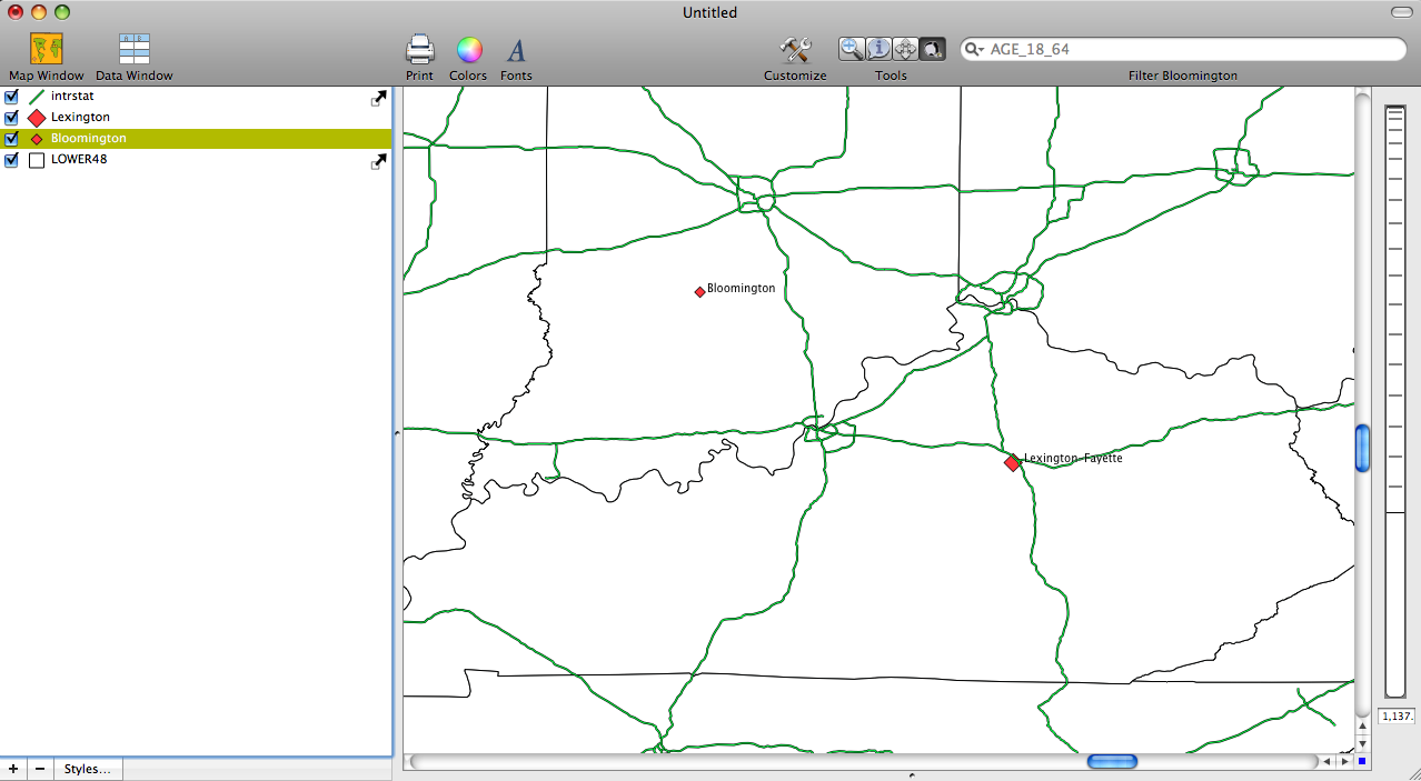 The first step in this analysis was simply identifying the locations of Bloomington and Lexington (Shown in Screenshot 1). A brief background of the two cities: Bloomington is the home of Indiana University Hoosiers and is home to nearly 100,000 residents and is famous for its rock quarries and beautiful scenery. Lexington is the home of the University of Kentucky Wildcats and the UK Basketball team which is a 1 seed in the 2010 NCAA basketball tournaments (GO CATS!!!). The Euclidean distance between the two cities is 135.81 miles and the distance by road is approximately 170 miles for both trips.