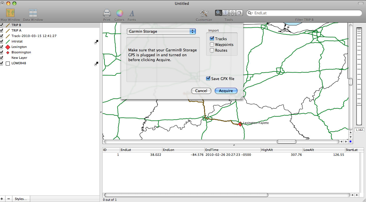 I am a frequent driver between Bloomington, Indiana and Lexington, Kentucky. In the past I have taken a route that was suggested by both logic and my GPS unit. However, recently a friend suggested that I try a different route to get home because it was faster, and a more relaxing drive. In order to determine which trip was more efficient I used my GPS unit to track my trip to see which one was better.