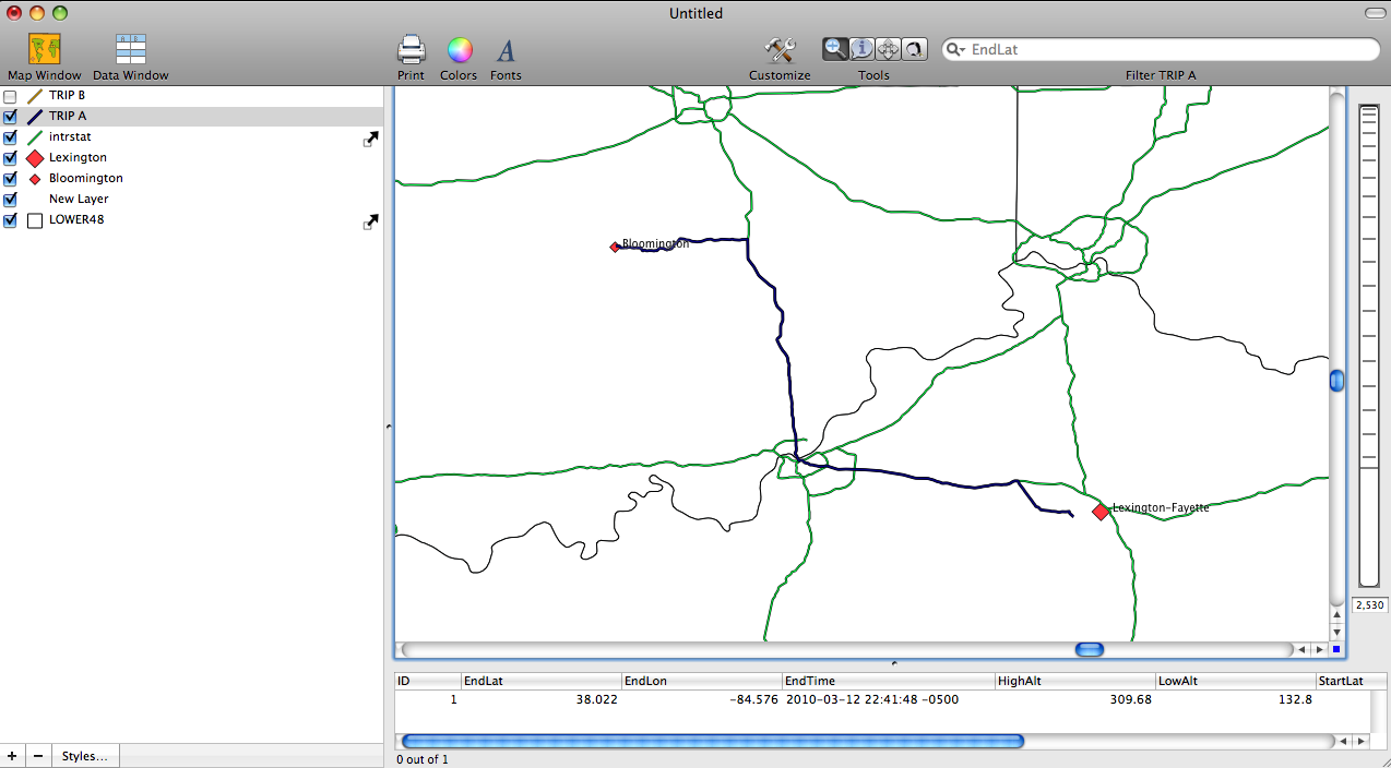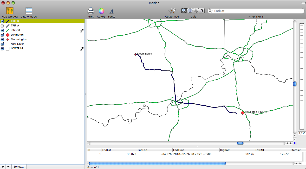 The next step was to examine the differences between times recorded from each trip. Screenshot 3 shows the data window for TRIP A and you can see that there is a start time and end time. For TRIP A it was determined that it took 2 hours and 55 minutes to get from Bloomington to Lexington. For TRIP B it took about 3 hours and 5 minutes. So based on these two trips it appears that TRIP A is faster. I will need to keep testing the two routes in order to determine if the difference in times holds over several trips. It is possible that I experienced factors on TRIP B that cause the trip to be slightly longer. Either way its a matter of minutes.